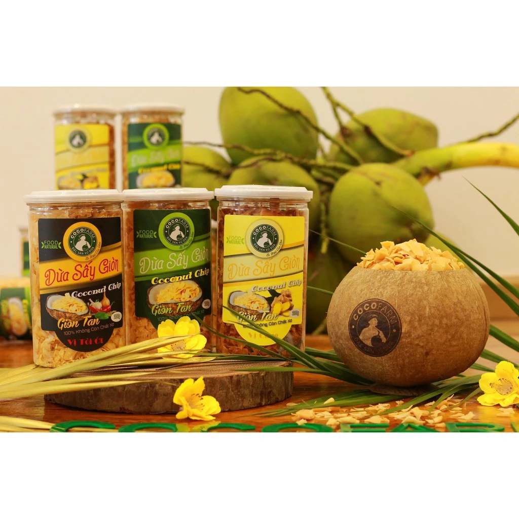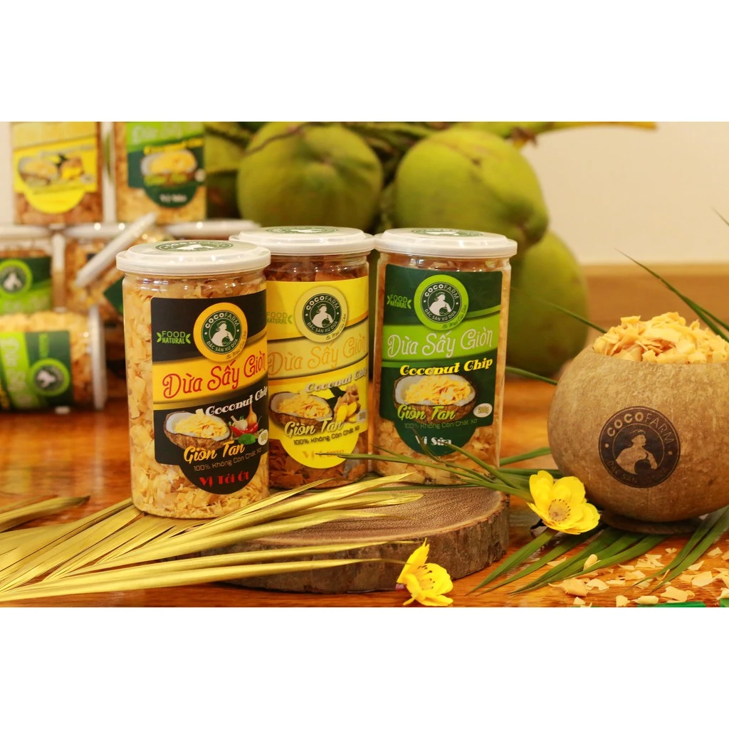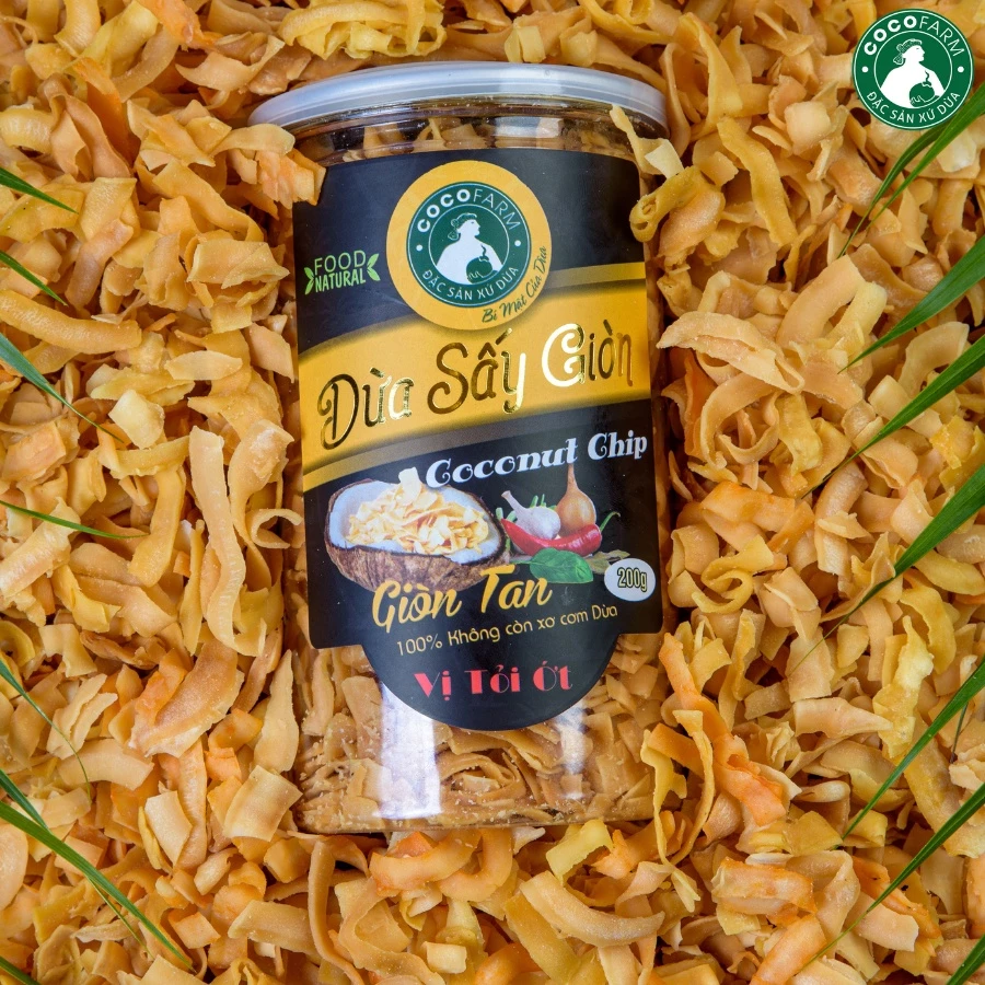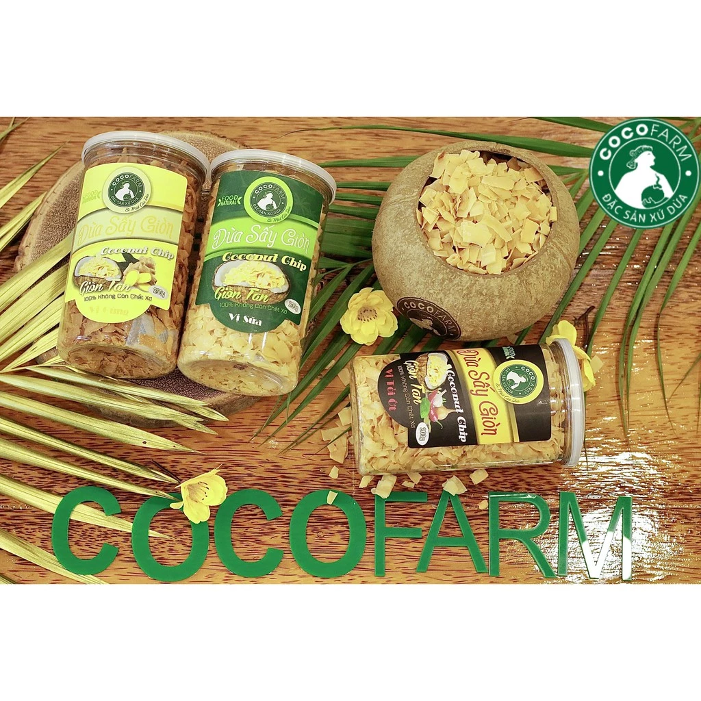Dừa sấy giòn Cocofarm 100% không còn bã xơ. Dừa được sấy phải là dừa to tròn, rám vàng, dày cơm. Dừa được sấy bằng công nghệ hiện đại giúp giữ được chất lượng tuyệt hảo và hương vị đậm đà.