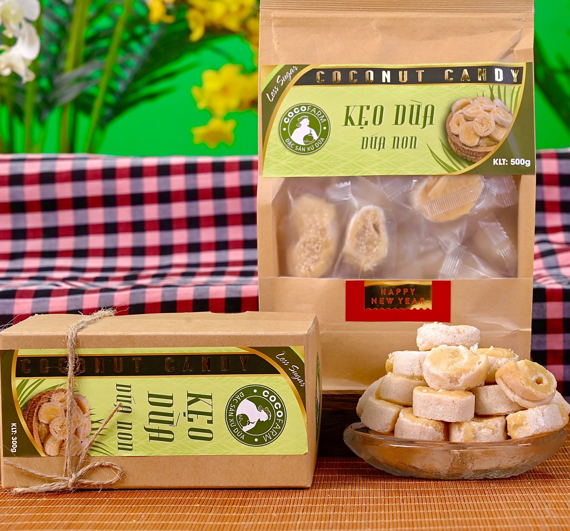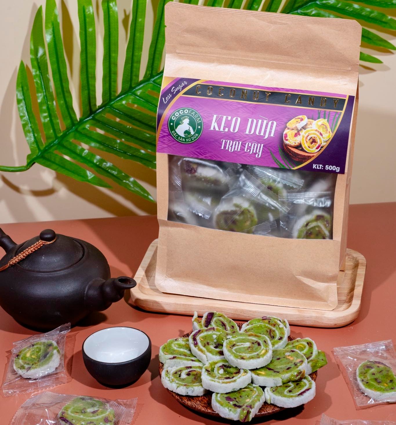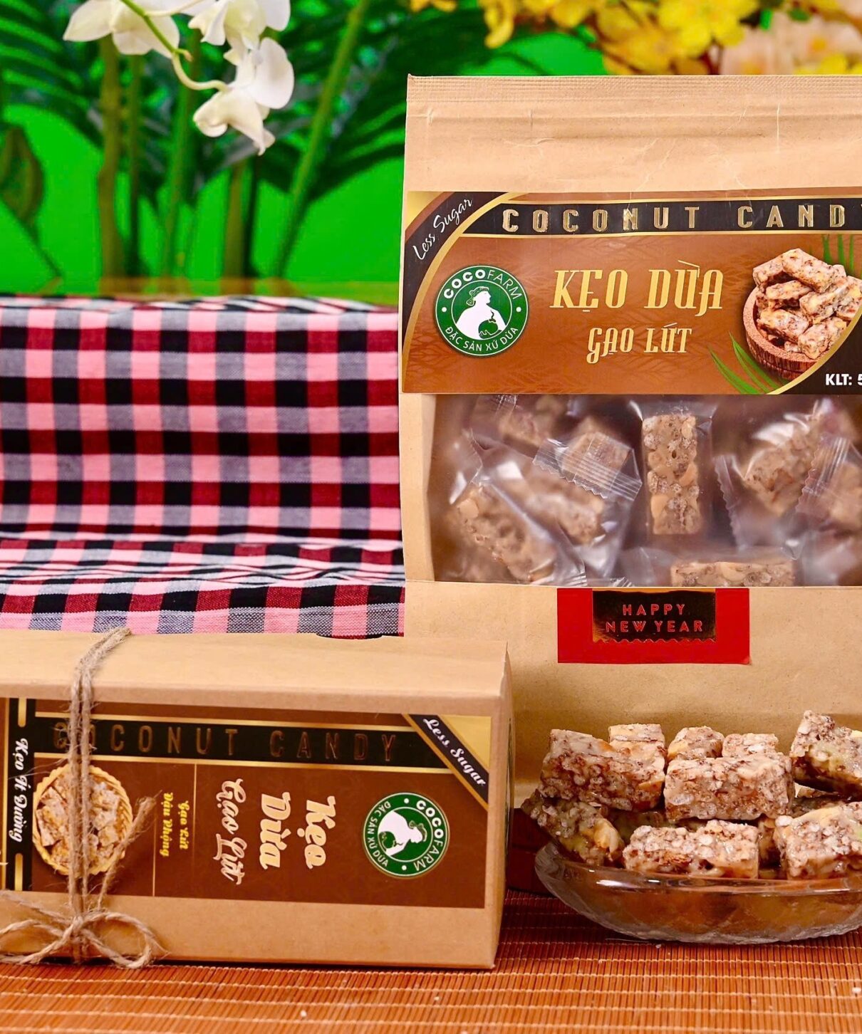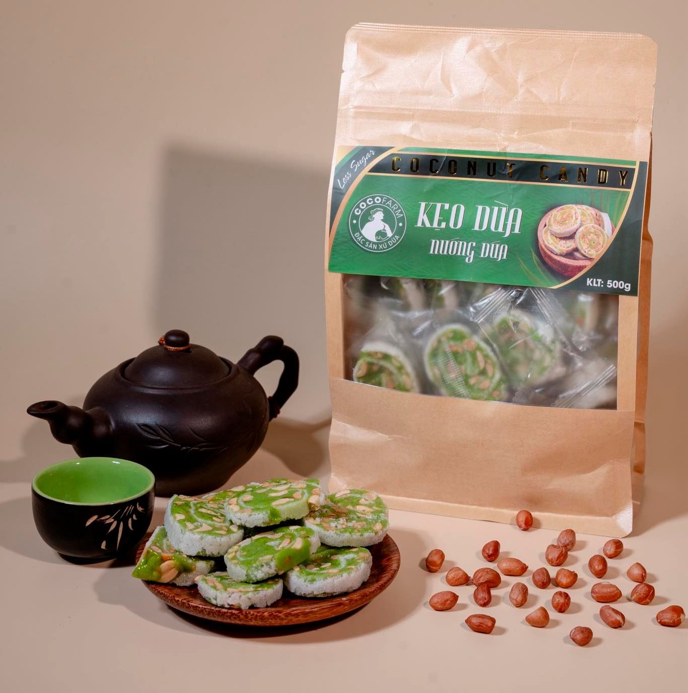 Kẹo dừa cuộn bánh tráng của Cocofarm là kẹo dừa ít ngọt, mềm mịn, thơm béo mà không dính răng vì sử dụng ít mạch nha và đường trong quá trình nấu kẹo, có 10 loại Kẹo Dừa khác nhau cho bạn lựa chọn, mỗi loại lại có một hương vị riêng ăn là ghiền!