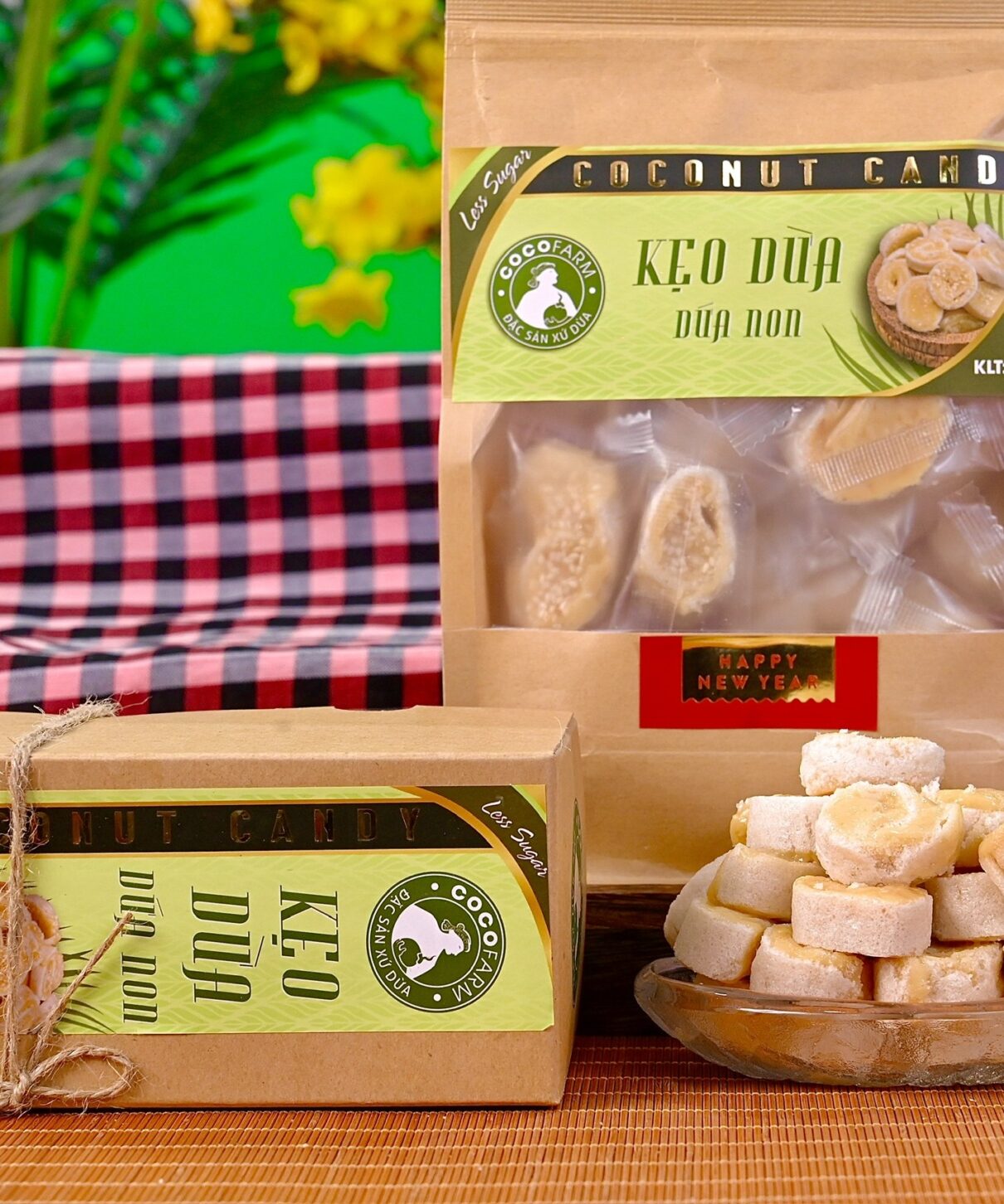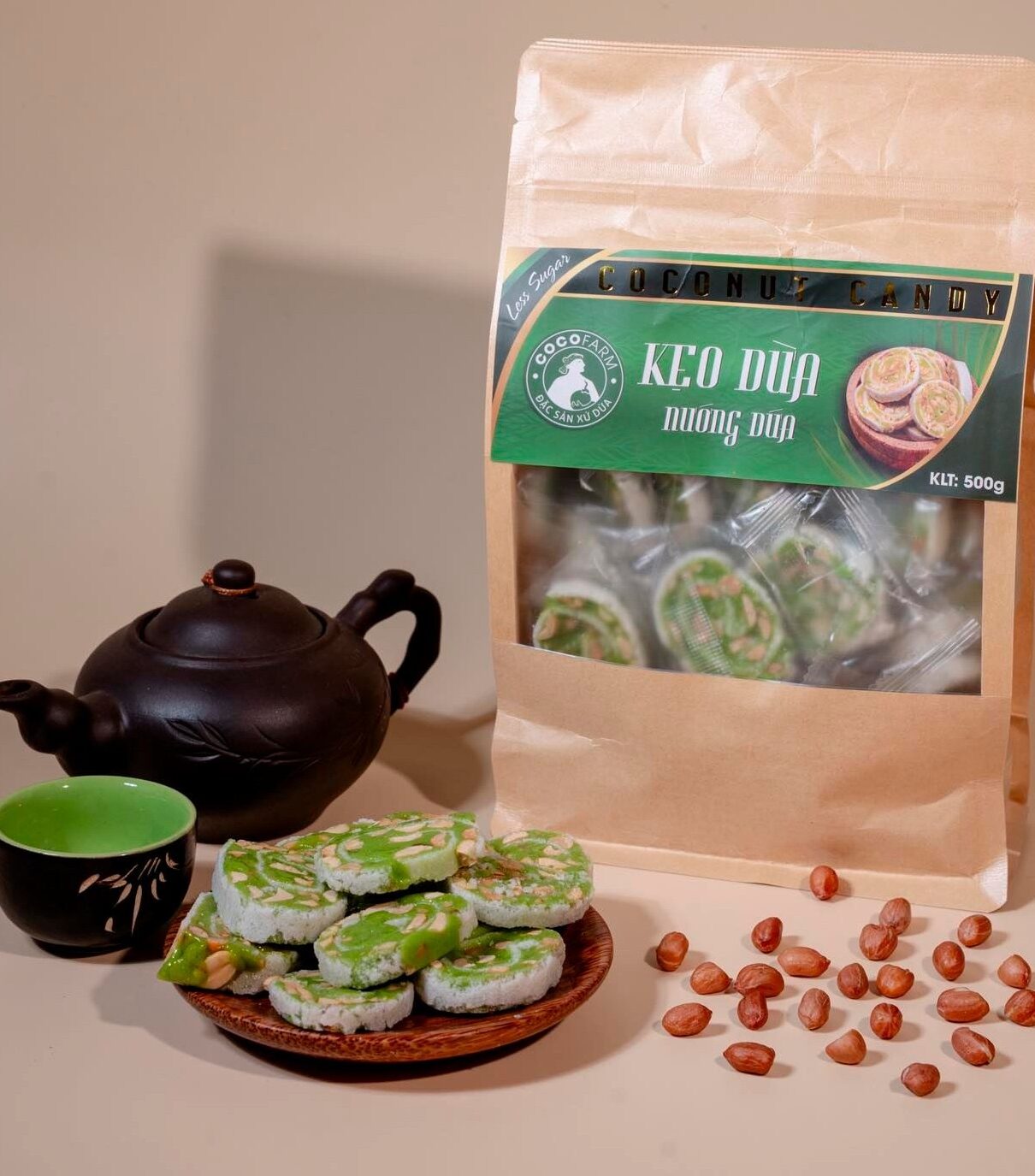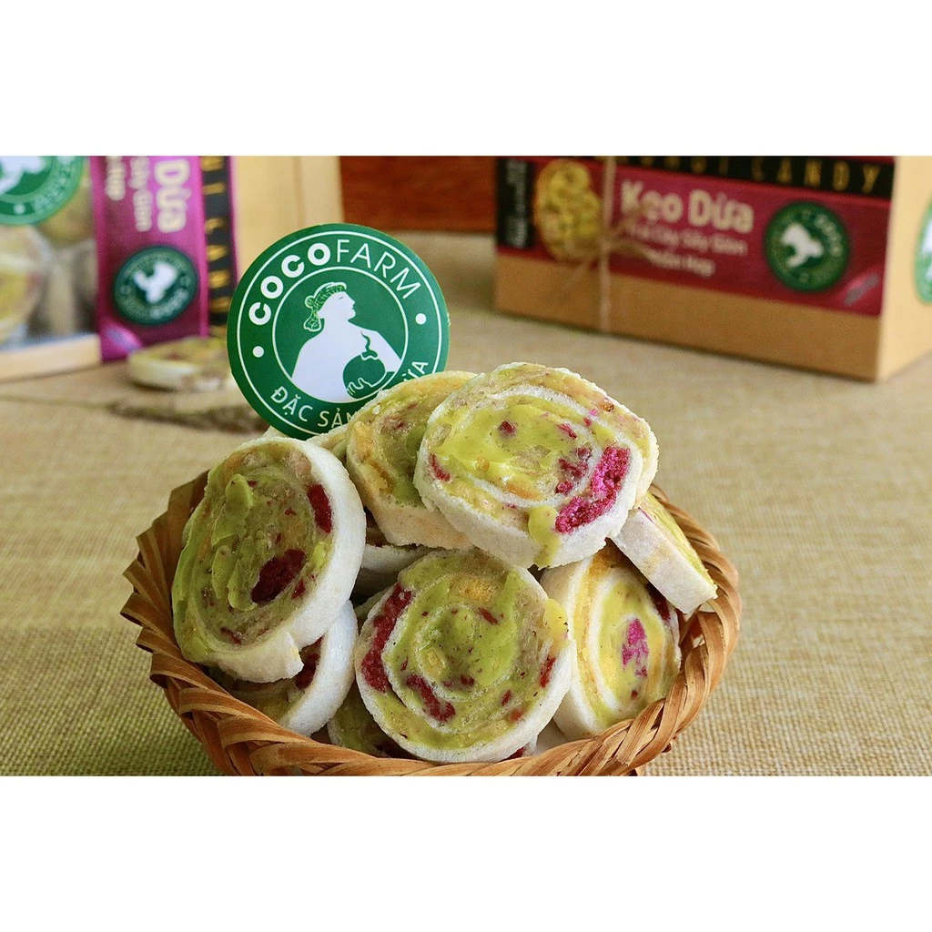 Kẹo dừa cuộn bánh tráng của Cocofarm là kẹo dừa ít ngọt, mềm mịn, thơm béo mà không dính răng vì sử dụng ít mạch nha và đường trong quá trình nấu kẹo, có 10 loại Kẹo Dừa khác nhau cho bạn lựa chọn, mỗi loại lại có một hương vị riêng ăn là ghiền!