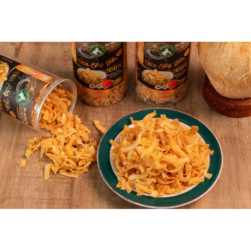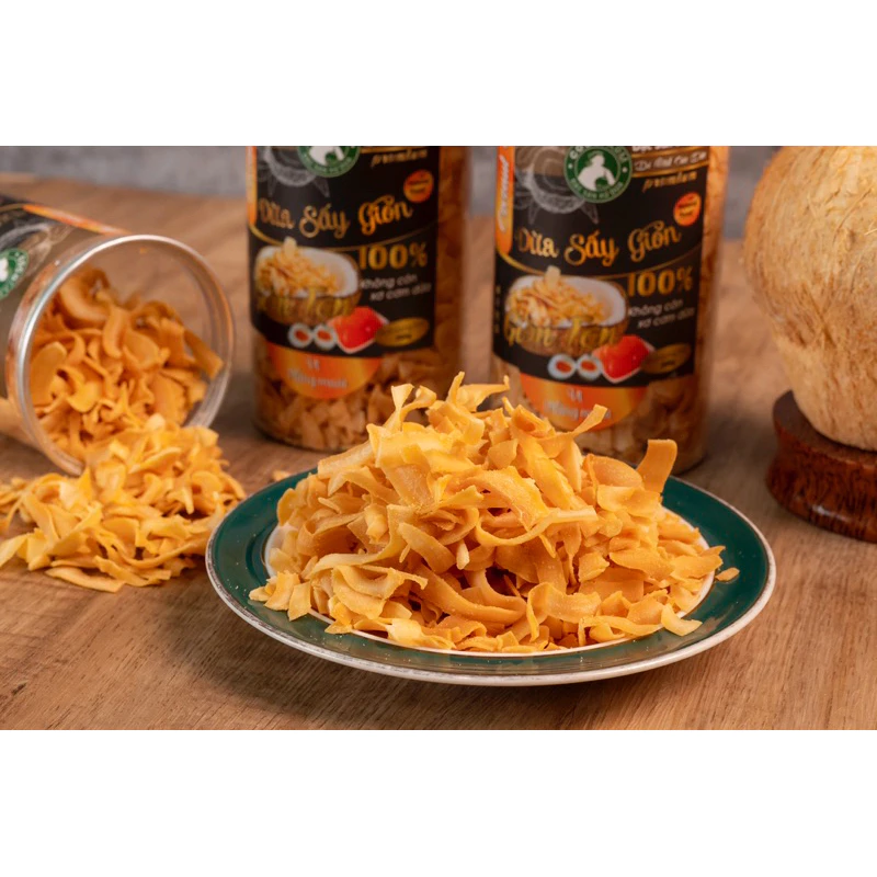 Dừa sấy giòn Cocofarm 100% không còn bã xơ. Dừa được sấy phải là dừa to tròn, rám vàng, dày cơm. Dừa được sấy bằng công nghệ hiện đại giúp giữ được chất lượng tuyệt hảo và hương vị đậm đà.