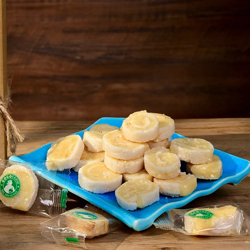 Kẹo Dừa Dứa Non cuộn bánh tráng Cocofarm được làm từ 1 loại dừa vô cùng đặt biệt của Bến Tre đó là cây Dừa Dứa. Dừa Dừa khác biệt so với dừa bình thường ở hương vị cơm dừa có mùi thơm của dứa, mùa nắng thì Dừa Dứa thơm hơn, nước cũng ngọt hơn. Nước Dừa Dứa thì ngọt và mát. Nếu bạn đã ăn kẹo dừa truyền thống thì Kẹo Dừa Dứa còn ngon hơn gấp nhiều lần, đặt biệt hơn nhiều lần như thế.