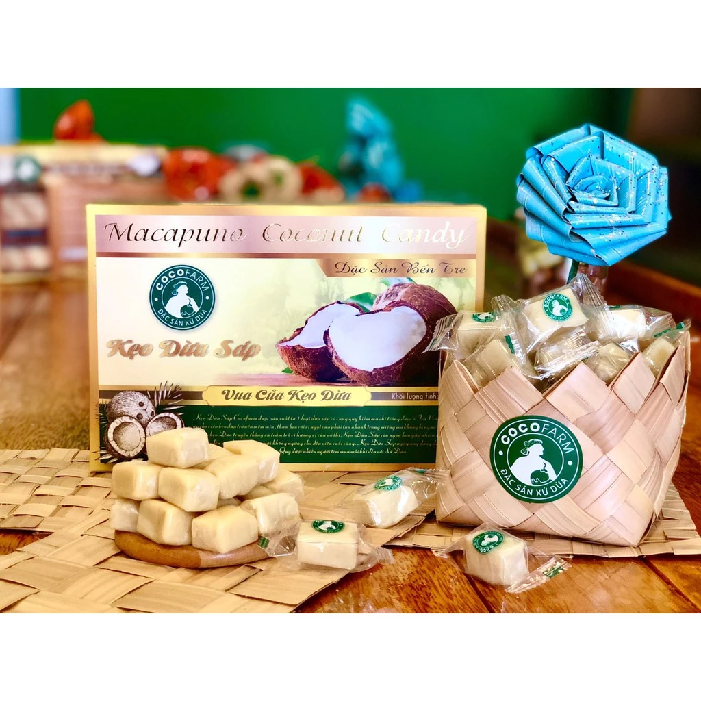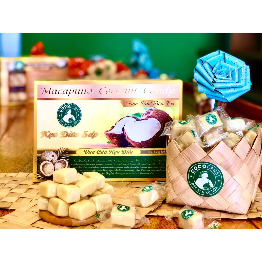 Kẹo dừa sáp Cocofarm được sản xuất từ một loại dừa sáp vô cùng quý hiếm chỉ được trồng ở Trà Vinh. Dừa sáp giúp cho viên kẹo trở nên mềm mịn, thơm béo với vị ngọt vừa phải tan nhanh trong miệng mà không bị ngán. Nếu bạn đã từng ăn kẹo dừa truyền thống và trầm trồ vì hương vị của nó thì kẹo dừa sáp còn ngon hơn gấp nhiều lần như vậy. Kẹo dừa sáp ngày nay đang dần nổi tiếng ở Bến Tre như một loại đặc sản quý được nhiều người tìm mua mỗi khi đến với xứ dừa.