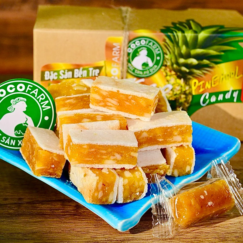 Sản phẩm Kẹo khóm ( Dứa ) tươi với nguyên liệu từ quả dứa chín mọng nhiều nước và dùng ít đường trong quá trình sản xuất, viên kẹo vàng tươi, mềm dẻo và thơm lừng vị dứa tươi tự nhiên nhiều vitamin tốt cho mọi người đặc biệt là các bé và ông bà. Kẹo khóm ( Dứa ) tươi là sản phẩm mới lần đầu tiên có mặt tại việt Nam chỉ có tại Cocofarm sẽ khiến bạn phải bất ngờ vì nó quá ngon. Ngon đến nỗi đây là loại kẹo bạn có thể ăn hết hộp lúc nào không hay.